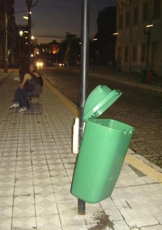 É evidente a inutilidade das lixeiras para guardar o lixo naquela via, uma vez que ele ganhou prestígio em forma de luminárias e destruição de patrimônio histórico.