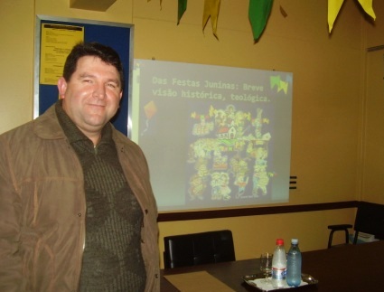 Na última quarta-feira de junho (30), o padre Adelar José Rosa (dir.) falou sobre as origens e significados das festas juninas, ante psicólogos da Sociedade Sigmund Freud, em sua maioria colegas da especialização em terapia psicanalítica.O estudioso começou explicando que não se trata de festas nascidas no Brasil, mas trazidas pelos portugueses, sendo de origem pagã e milenar. Os europeus comemoravam há muitos séculos o solstício de início do verão no hemisfério norte e a Igreja Católica cristianizou a data, centrando-a em São João Batista, o primo de Jesus, que teria nascido em 24 de junho. Ficou com o apelido de festa joanina, que derivou para "junina", como se fosse pelo mês de junho (veja na Wikipédia).