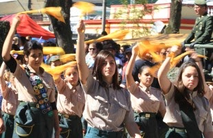 | Clube dos Desbravadores, equivalente escotista do adventismo (v. descrição), anuncia um futuro de paz, em desfile na Avenida Bento Gonçalves. |
